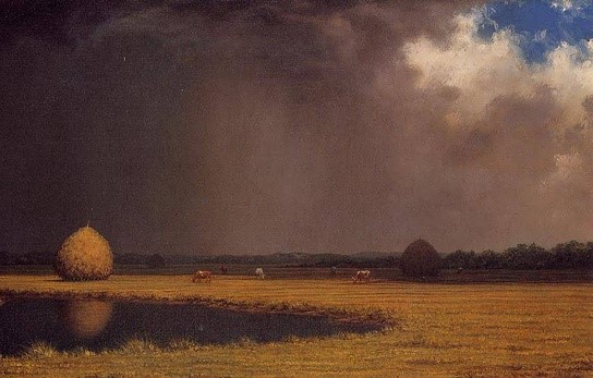 The idea of late July really took hold after I saw an exhibition of Martin Johnson Heade paintings at Boston’s Museum of Fine Arts. In haystack-dotted salt marshes and seascapes, Heade showed his obsession with New England’s atmospheric light and weather effects, particularly the encroachment of dark storm clouds on a sunny sky, so that segments of an otherwise innocuous rural landscape are eerily illuminated with pin-hole beams. His luminous canvases seem to me stories about the sky.